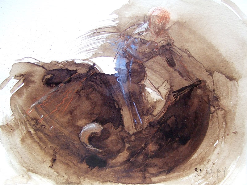 C’est lui le héros, repartant mufle dans le sable contre cette armée rouge, lui le combattant sans peur sur la corne droite, mais avec douleur sur le côté gauche, d’où une seule série de naturelles. Avec son intégrité physique totale il aurait montré à la race des hommes que sa bravoure n’avait pas de limite. Alamo, combat sans issue, jusqu’au bout de la musique où dans un frisson d’humanité animale, le toro est devenu l’égal de l’homme.